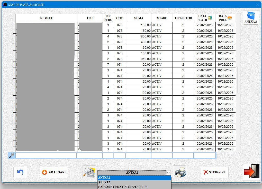 Situatiile care se exporta sunt: anexa 1, anexa 2, fisierul dbf pentru Trezorerie si in plus fata de PRESAJ, anexa 3 (cu verificarea sumelor si numarului de beneficiari).