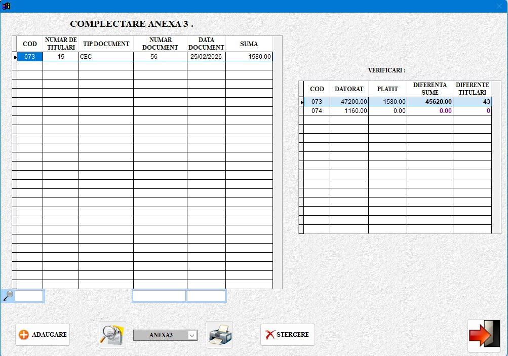Programul este protejat prin parola. Datele se pastreaza pe fiecare luna, ele fiind preluate automat prin deschiderea unei noi luni.